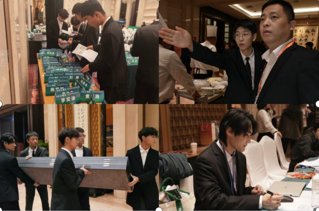 会前,志愿者经培训熟悉会场布局、服务流程,打磨引导话术、掌握搬运规范等技能。活动前期,志愿者值守会场大堂和签到区域,耐心引导嘉宾前往会场、完成签到,并协助组织嘉宾在背景板前拍照留念,用热情服务为大会开篇;活动中期,在签约仪式环节,高效协作搬运签约台设备,保障仪式快速筹备到位;圆桌论坛环节,迅速完成嘉宾沙发的搬运与摆放,为论坛有序开展提供有力支撑;活动后期,他们持续坚守岗位,细致引导嘉宾离场,以贴心服务与饱满热情为大会注入青春动能,用青春担当展现“好客山东、美丽济南”的良好形象,为大会画上圆满句号。