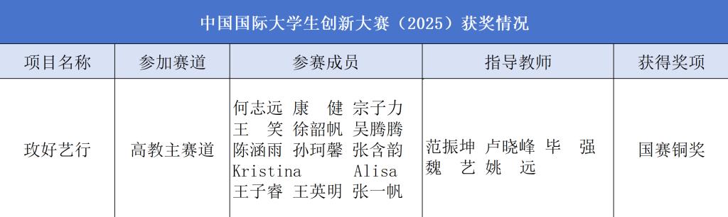 近日,由教育部等12个部门主办的中国国际大学生创新大赛(2025)总决赛圆满落幕。我校参赛项目《玫好艺行》荣获国赛铜奖,这是我校连续第二年在该赛事中获得国赛奖项,也是首次在高教主赛道中斩获。