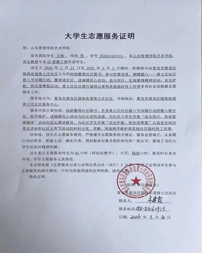 2024级音教专业杨宇航,在肥城市为相海宏程留守儿童开展14天音乐教学志愿服务。他结合孩子兴趣讲解音乐知识,衔接专业与社会需求,锤炼综合能力,贡献青春力量;2023级文化产业管理专业张怡冉,在迈尔英语教育机构担任助教。她全程参与寒假活动策划与落地,打磨方案、布置现场,大幅提升教学与管理能力,积累实践经验;2025级音乐教育专业王栋,在青岛黄土庄社区开展志愿服务。他结合所学,为小学生宣讲雷锋精神、普及寒假安全知识,践行志愿精神,锤炼意志品质。